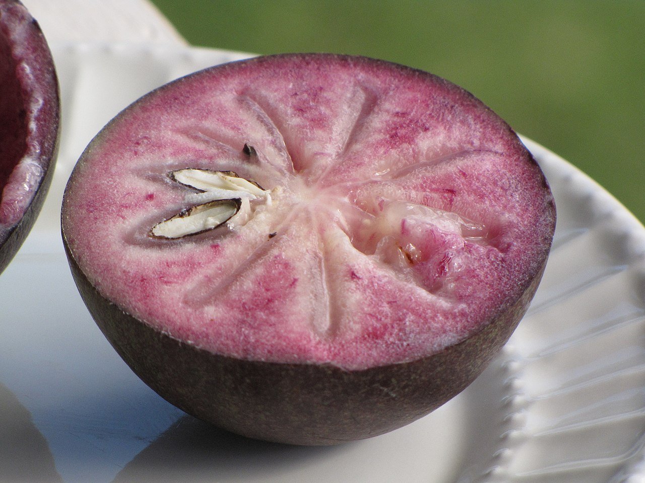 Natural da América Central, o abiu roxo chama atenção pela coloração roxa-vibrante e sabor bastante adocicado. Em inglês, a fruta (também conhecida como caimito) é chamada de star apple, pelo formato peculiar que as sementes formam dentro da polpa quando ela é cortada transversalmente, lembrando muito uma estrela.